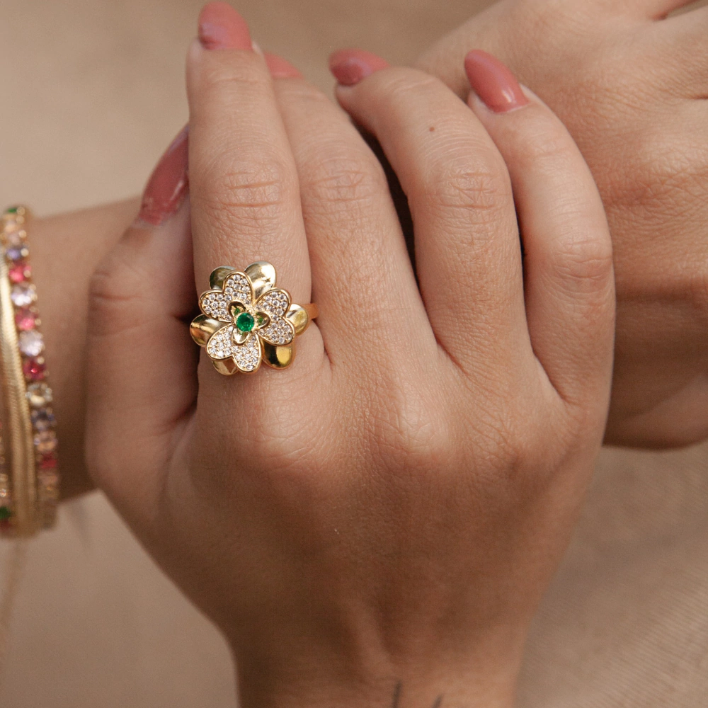 Delicado e encantador, este anel traz a sofisticação das flores em um design elegante e atemporal. A peça é banhada a ouro 18K e apresenta uma charmosa flor cravejada com microzircônias, realçando seu brilho refinado. No centro, uma deslumbrante pedra verde adiciona um toque vibrante e sofisticado, tornando o anel perfeito para compor looks românticos e cheios de personalidade. Seja para usar sozinho ou combinado com outras joias, este anel é uma escolha delicada e cheia de brilho. Diâmetro da flor aproximadamente 2 cm. Peso 5,5 gr.