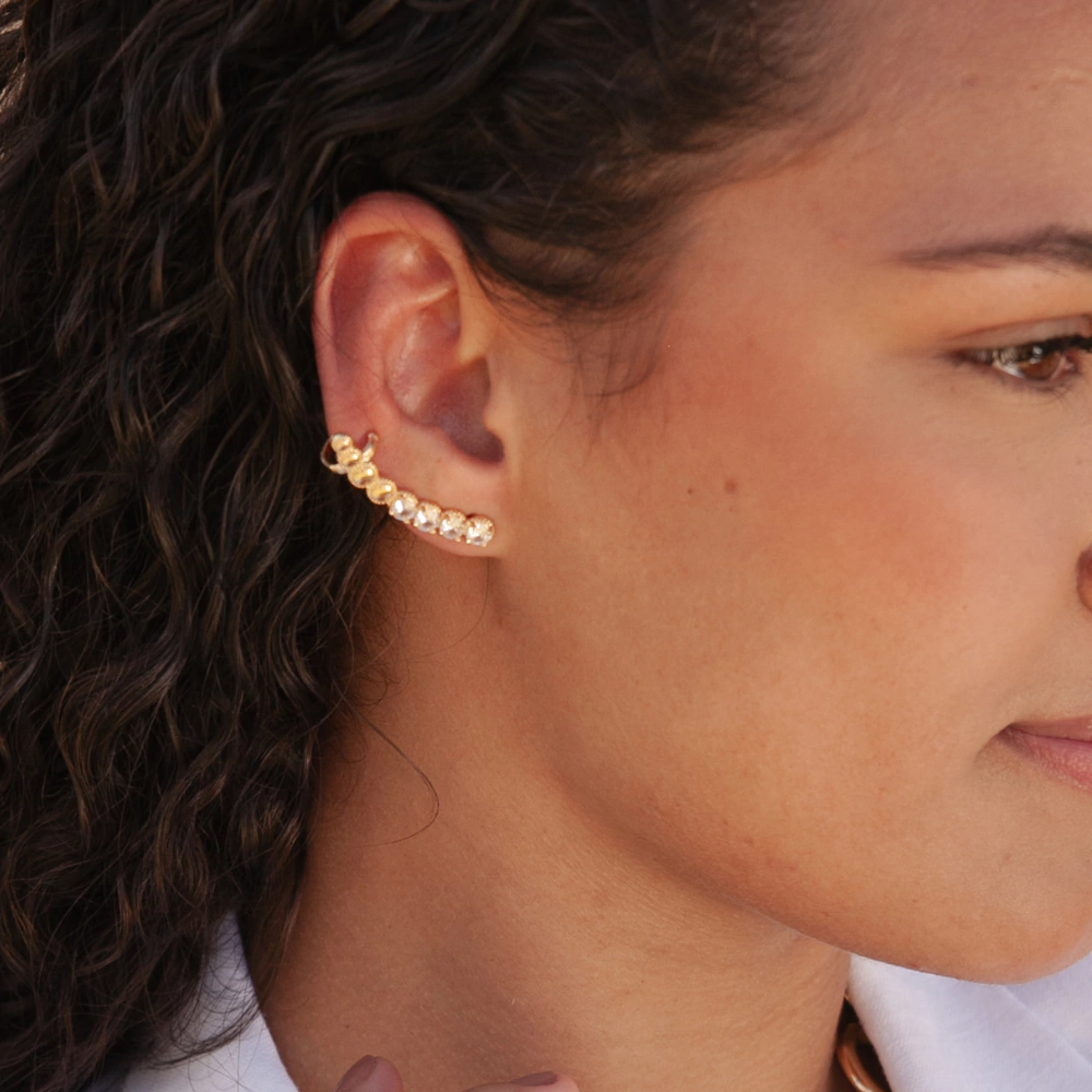 O brinco ear cuff é uma peça inovadora e elegante, projetada para adicionar um toque moderno e sofisticado ao seu estilo. O design apresenta uma série de esferas acompanhadas de cristais, delicadamente posicionados ao longo do cuff, criando um efeito de brilho e textura que captura a luz de maneira encantadora. O ear cuff é ideal para quem busca um acessório que se destaca e oferece uma alternativa ousada aos brincos tradicionais. Fácil de usar e versátil, ele se adapta ao contorno da orelha, proporcionando um ajuste confortável e seguro. Perfeito para ocasiões especiais ou para elevar seu estilo diário com um toque de elegância contemporânea. Medida das esferas aproximadamente 0,04 de diâmetro e 3,5 cm de comprimento. Peso aproximado 4,5 gr.