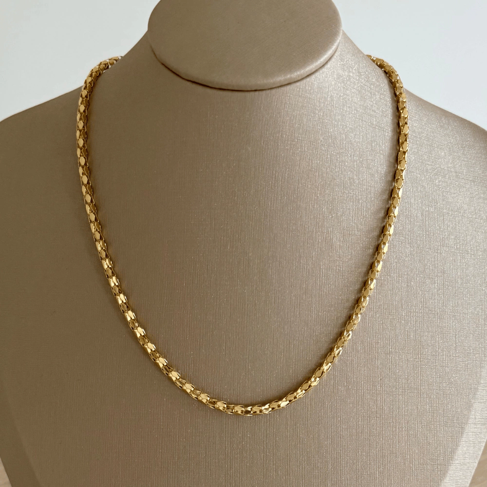 Colar banhado a ouro 18k com 40 cm de comprimento, desenvolvido com uma corrente diferenciada e moderna, que traz um charme atemporal. Seu brilho elegante valoriza qualquer produção, do casual ao sofisticado. Com peso aproximado de 7,2 g, é leve e versátil, ideal para o dia a dia ou ocasiões especiais.