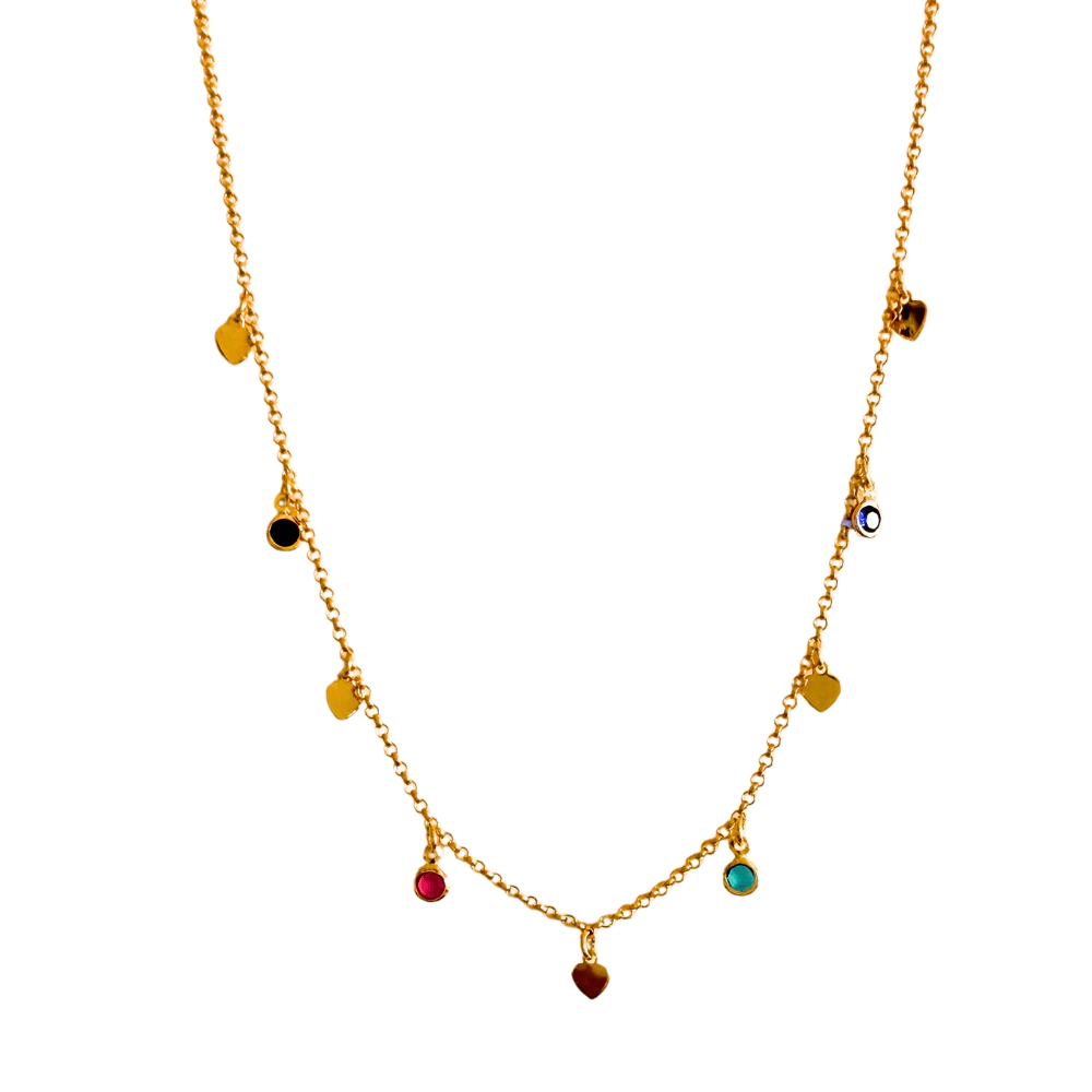 Um acessório cheio de charme e vivacidade, composto por uma corrente de 35 cm com extensor de 10 cm, que permite ajuste perfeito. Ao longo da corrente, delicados pingentes de pontos de luz coloridos se alternam com corações lisos, criando um visual romântico e alegre. Com peso de 3,7 g, é leve, confortável e ideal para iluminar produções do dia a dia ou ocasiões especiais. Banhado a ouro 18k, une sofisticação, brilho duradouro e acabamento de qualidade.