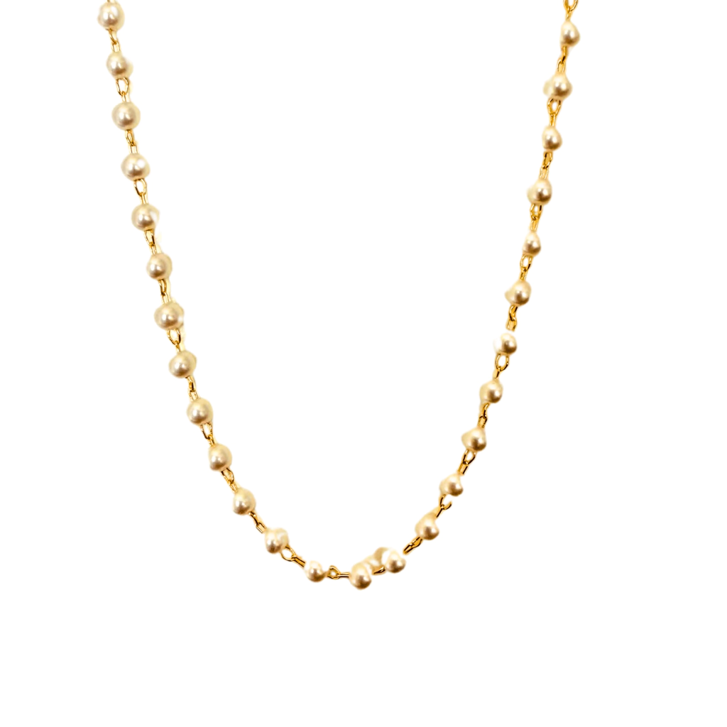 O Colar pérolas tem de 40 cm de comprimento. É uma peça que traduz sofisticação e delicadeza. Com pérolas finamente selecionadas ao longo de sua extensão, esse colar é banhado a ouro 18K, proporcionando um brilho sutil e refinado. Seu design clássico e atemporal permite composições elegantes, seja usado sozinho para um toque minimalista ou combinado com outras joias para um visual sofisticado. Leve e confortável, é perfeito para ocasiões especiais ou para elevar o estilo do dia a dia. Invista em um acessório de alta qualidade que exala charme e requinte. Peso 4,4 gr.
