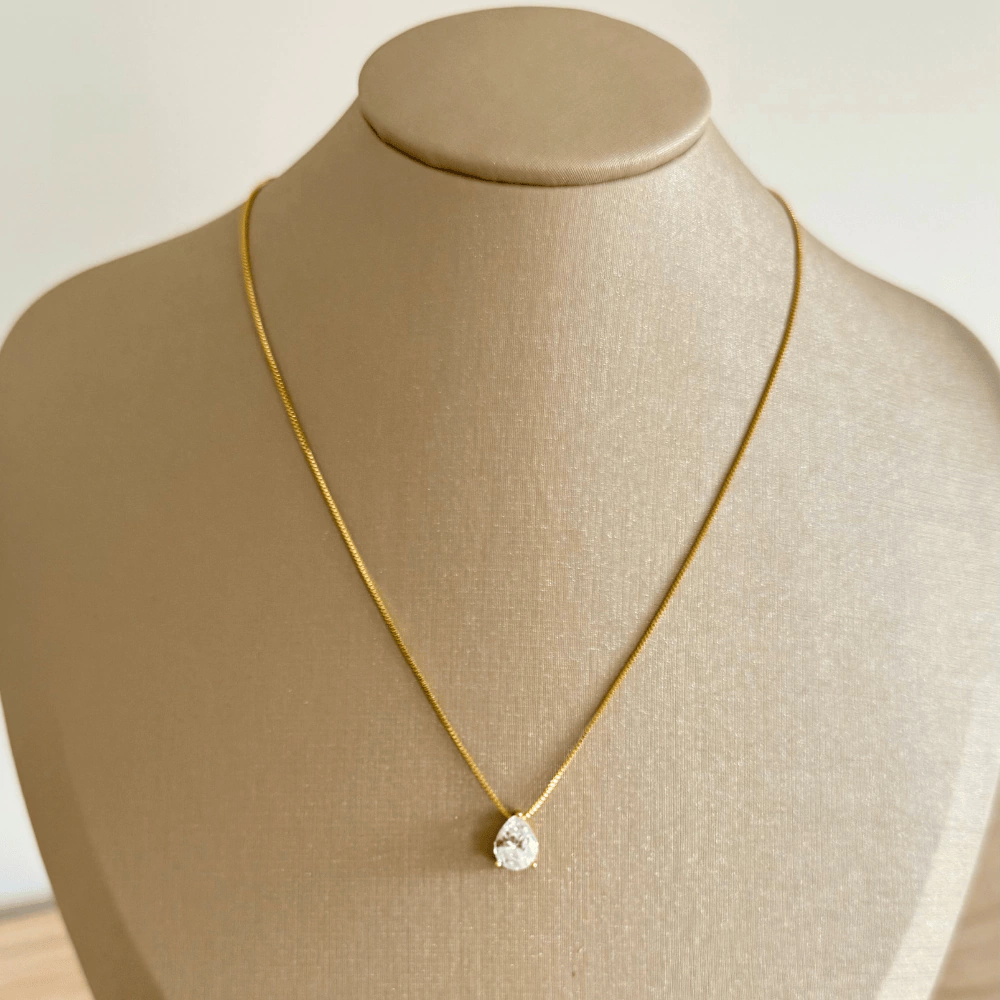 Delicado e sofisticado, este colar é banhado a ouro 18k e possui 40 cm de comprimento com extensor de 5 cm, garantindo versatilidade no ajuste. Seu destaque é o pingente em formato de gota em zircônia cristal, medindo 1 cm de altura x 0,8 cm de largura, que confere um brilho intenso e atemporal.
