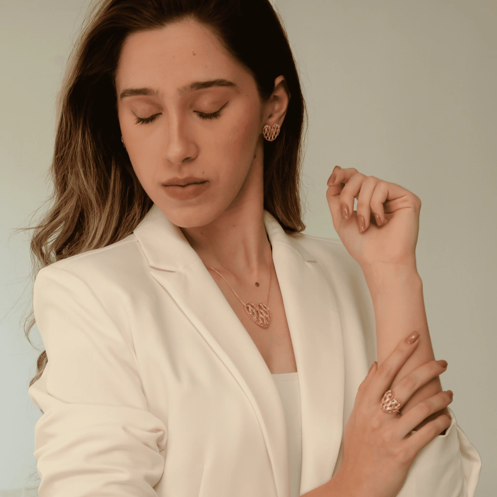 O conjunto coração macramê reúne peças encantadoras que combinam a beleza do coração com a delicadeza do macramê. O colar apresenta um pingente em forma de coração, evocando sentimentos de amor e carinho, enquanto o detalhe em macramê adiciona uma textura única e artesanal à peça. A combinação desses elementos cria um visual romântico e boêmio, perfeito para quem busca uma joia cheia de significado e estilo. Versátil e elegante, este colar pode ser usado sozinho como uma declaração de moda ou combinado com outras peças para criar camadas sofisticadas. Seja para o uso diário ou para ocasiões especiais, o colar ping coração macramê é uma adição encantadora a qualquer coleção de joias. Colar com 40 cm e com extensor de 5 cm. Pingente 2,2 cm x 2,9 cm altura. Peso 5 gr.